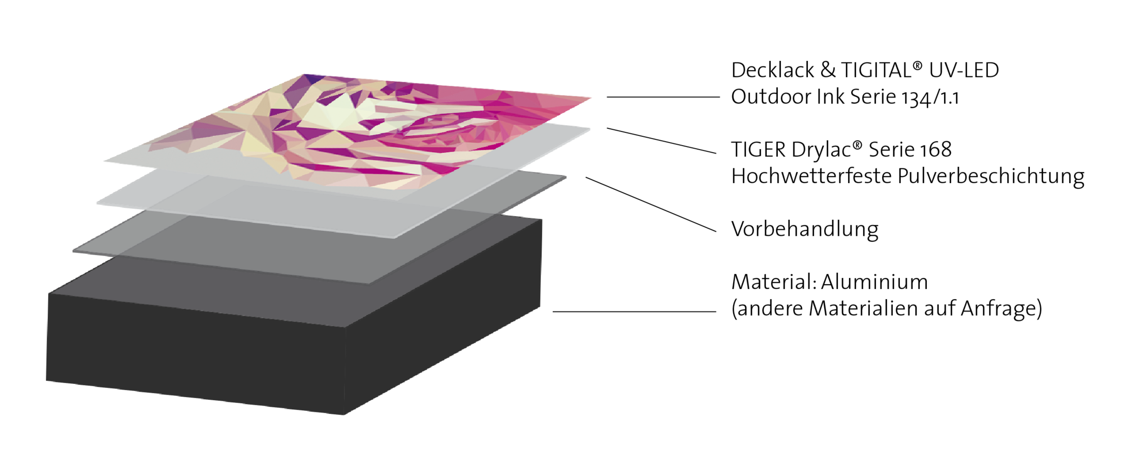 Ihr Wunschmotiv auf Aluminium oder Stahl: Hochmoderner Digitaldruck mit UV- und farbstabilen TIGITAL® Inks setzt kraftvolle Akzente und unterstreicht die Ästhetik Ihres Objekts.