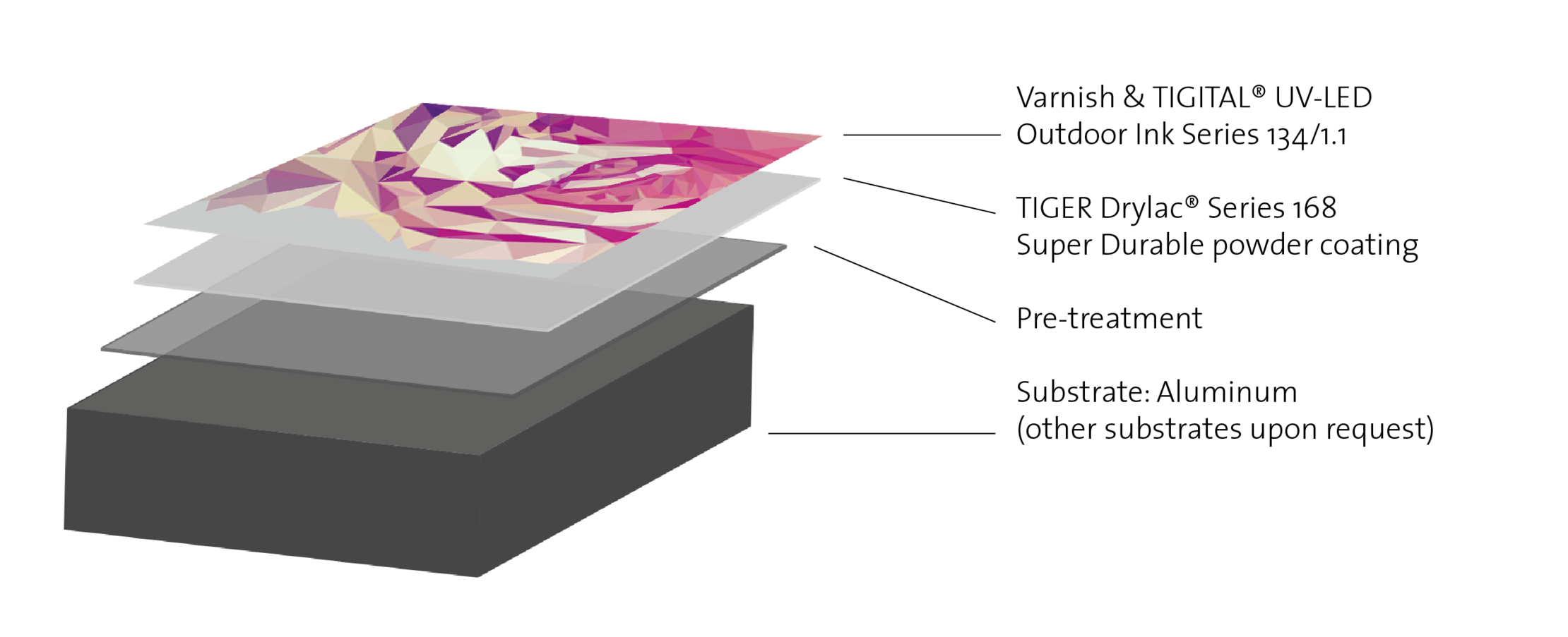 TIGER ArchiPRINT is a combination of powder coating technology (TIGER Drylac® Series 168) with digital printing technology utilizing UV-LED outdoor inks (TIGITAL® Series 134/1.1) and has been designed with durability, superior UV and color resistance in mind for maximum decorative aesthetics and protection of the investment.